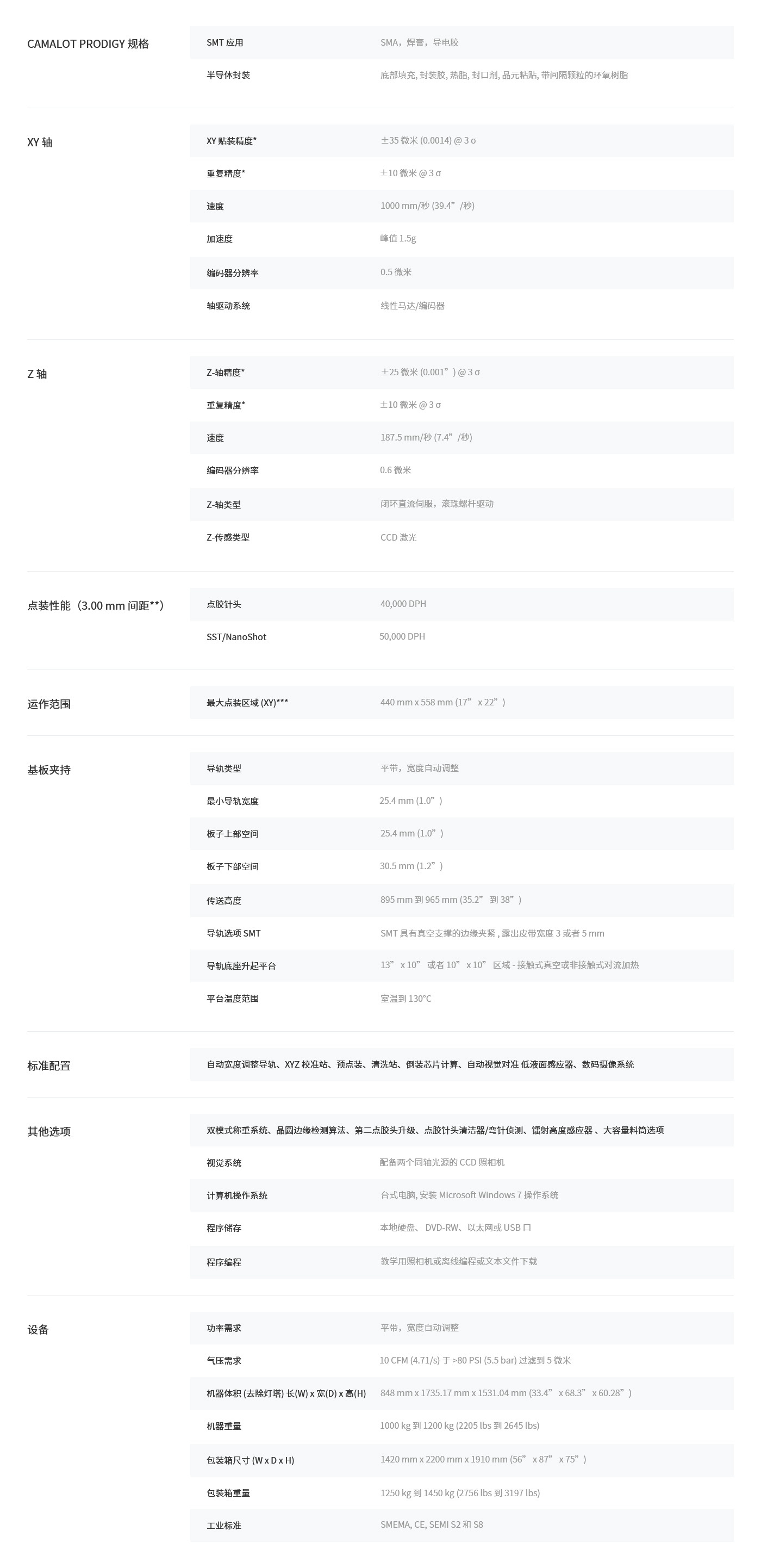 Prodigy 專為高速、高精度的點膠而設計和打造。Camalot 工程師們憑借超過 20 年在線性馬達和先進的運動控制系統方面取得的經驗,使加速度峰值達到 1.5g。 最先進的 XY軸驅動系統是新一代點膠的關鍵點。創新的剛性框架設計融合了先進的線性驅動結構使點到點的移動迅速,高精準和長期的可重復性。